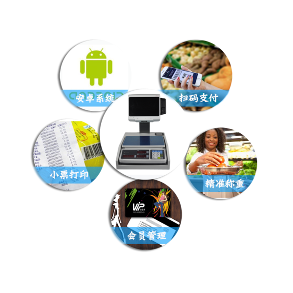 據介紹,安卓智能收銀秤專門對于生鮮行業,集成會員辦理、手機支付、推廣分析、精準稱重為一體,可完成數據化運營,積分、余額、采購信息等線上、線下同步。其功用優勢如下: