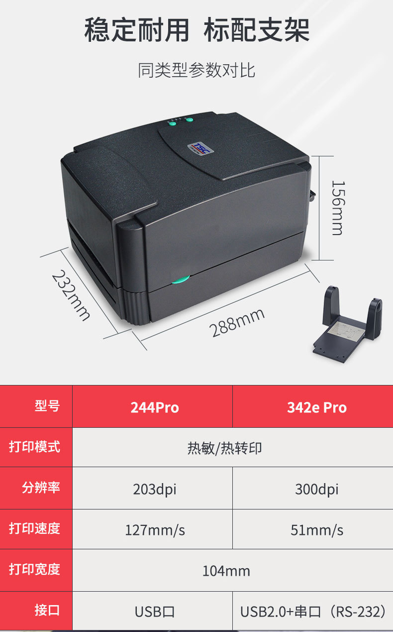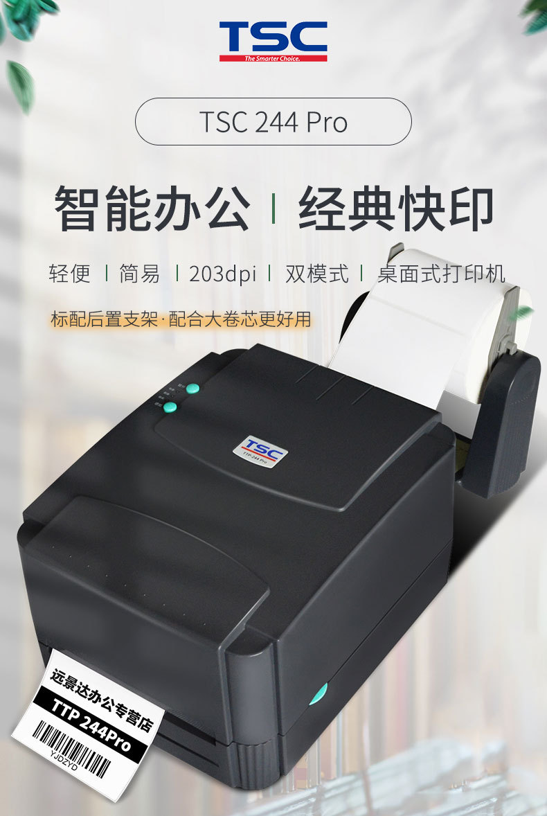 TSC的經典之作--TTP-244 Pro是TTP-244 Plus的升級版,這款機器的外形配置與TSC-244 Plus的一樣,但是打印速度上有所提升。除了延續使用TSCTM 獨特的雙馬達設計,有效延長機器使用壽命之外,還全面升級標準內存容量至 2MB Flash ROM、8MB SDRAM,可內建一組字型(繁體中文、簡體中文、日 文漢字、韓文字型四者擇一),配備更高階的 32 位中央微處理器及 USB 通訊接口大幅提升數據處理及傳輸速度。