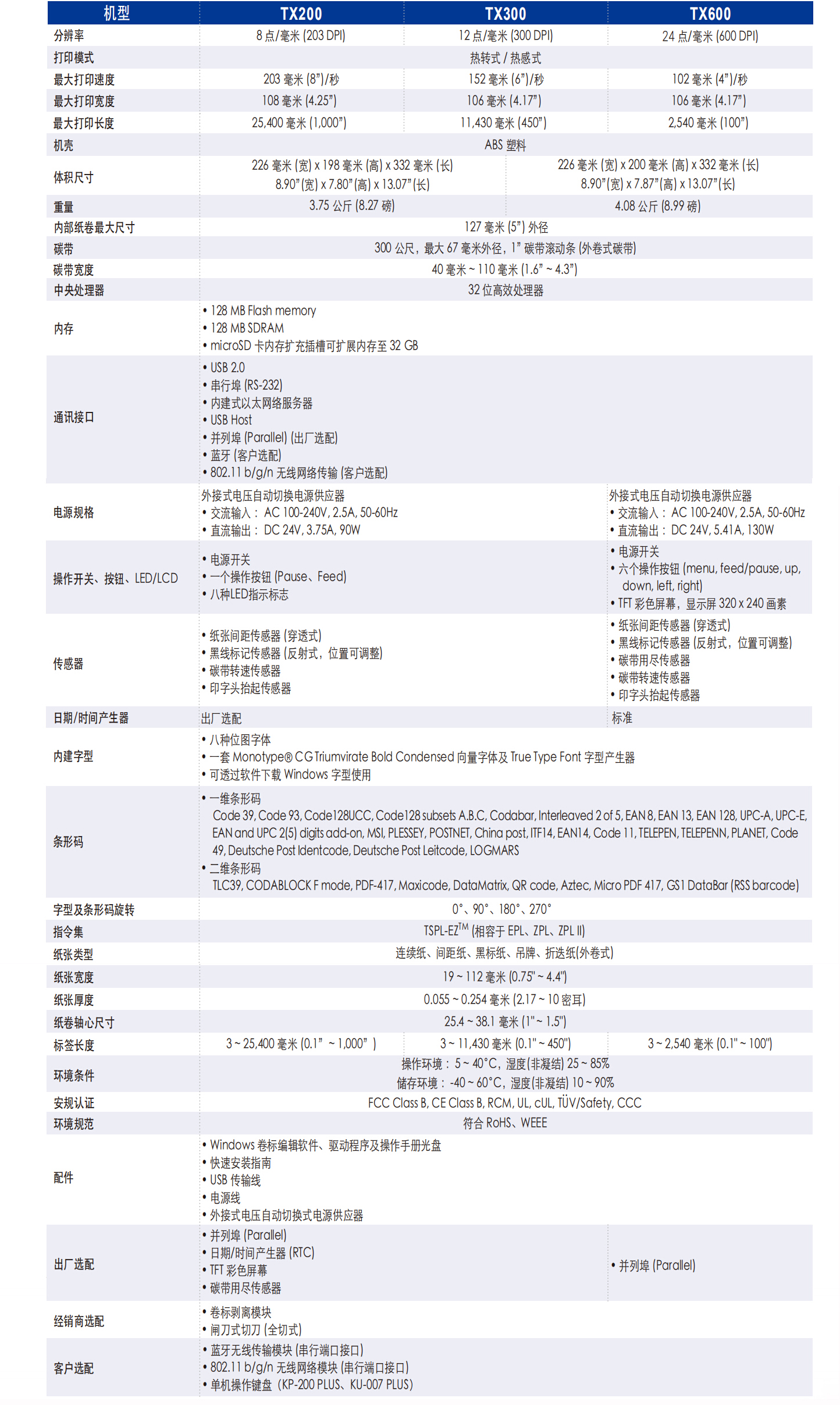 TX200系列完整的配備其中USB 2.0、USB host、內建式乙太網路列印伺服器與串列埠的標配,加上藍牙、802.11a/b/g/n無線網路與串列埠的選配通訊介面,其他選配還包括彩色螢幕、標簽剝離模組、切刀。