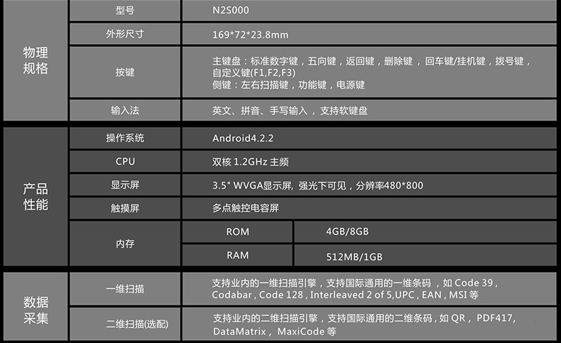 - N2S000是一款綜合性能高、適用領域廣的新一代安卓移動智能終端,采用黃金曲線和防滑落楞線設計;