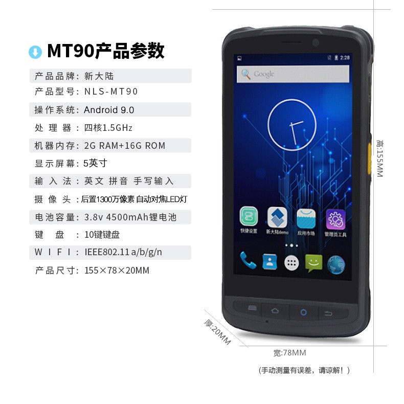 NLS-MT90 便攜式數據采集器內置深度定制的安卓操作系統,擁有工業級的耐用性,4500mAH超大容量電池,支持一維和二維條碼掃描,可通過 4G無線數據通信、Wi-Fi 進行數據的傳輸。 廣泛應用在物流快遞、倉儲管理、連鎖零售、食品溯源、醫療衛生、經銷商管理、資產盤點等行業。新大陸NLS-MT90價格請電話聯系:400-808-6916或者聯系我們的在線客服