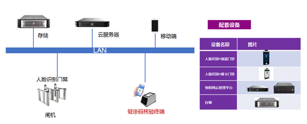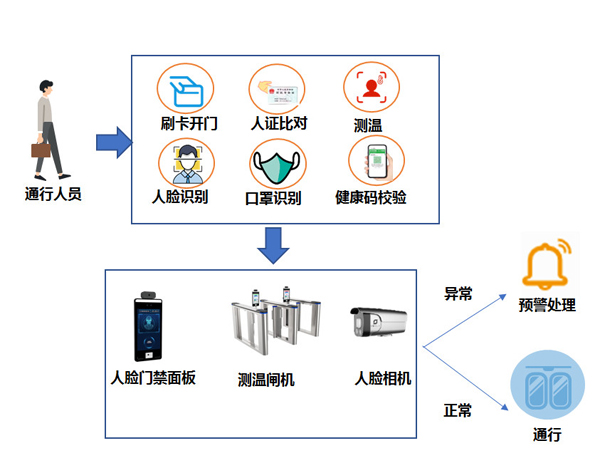 門禁方案是智慧園區(qū)整體解決方案的重要組成部分,主要由人臉識別測溫門禁一體機、人臉識別閘機伴侶、門禁控制器、健康碼核驗終端設(shè)備、綜合安防平臺等組成。