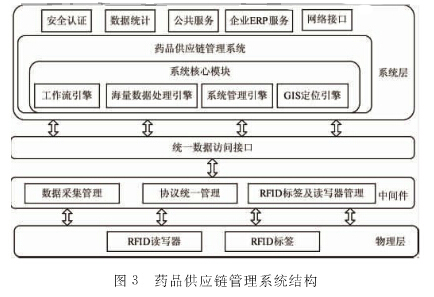 ? ? 藥品供應鏈管理系統從系統整體層次考慮,包括物理設備層、中間件層和應用系統層,如圖3所示。每一層均實現不同的功能,物理設備層是硬件層,采集或寫入基本數據;中間件層和應用層為軟件層,實現系統數據通道及預定義功能;應用層的核心為藥品供應鏈綜合管理平臺,該平臺在系統核心模塊的支撐下工作,包括工作流引擎、海量數據處理引擎、系統管理引擎以及GIS定位引擎,四大核心引擎保證了整個系統的平穩運行。同時在系統應用層范圍內,提供了一些附屬功能及接口,包括安全認證功能、數據統計功能和對外服務功能,同時提供Internet網絡接口,方便外界對系統的訪問。